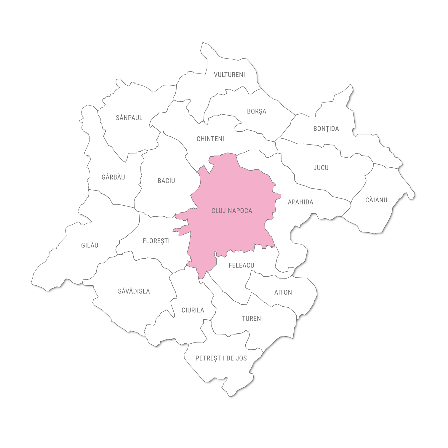 Zona Metropolitană Cluj este constituită ca o asociație de dezvoltare intercomunitară, din care fac parte următoarele unități administrativ teritoriale: municipiul Cluj-Napoca și comunele Aiton, Apahida, Baciu, Bonțida, Borșa, Căianu, Chinteni, Ciurila, Feleacu, Florești, Gilău, Gârbău, Jucu, Petreștii de Jos, Săvădisla, Sânpaul, Tureni și Vultureni.